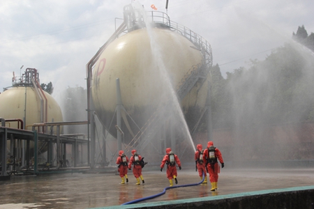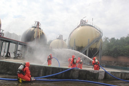 此次演練情景模擬為我市各縣(市、區(qū))、園區(qū)突降大暴雨,涪江、郪江遂寧段水位持續(xù)上漲,個(gè)別地方即將達(dá)到保證水位,射洪市、經(jīng)開區(qū)、船山區(qū)、蓬溪縣多地多點(diǎn)發(fā)生洪水漫壩、城市內(nèi)澇、山體滑坡、道路沖毀、人員被困等洪澇及次生災(zāi)害。我公司液氨罐區(qū)D號(hào)球罐被山洪沖擊受損,發(fā)生液氨泄漏。災(zāi)情發(fā)生后,射洪市和我公司立即啟動(dòng)?;沸孤秾m?xiàng)應(yīng)急預(yù)案,組建現(xiàn)場(chǎng)指揮部,組織市直有關(guān)部門緊急趕赴災(zāi)害現(xiàn)場(chǎng),開展緊急疏散、力量調(diào)度、物資調(diào)集、環(huán)境監(jiān)測(cè)、倒罐搶修等災(zāi)害應(yīng)對(duì)處置工作。